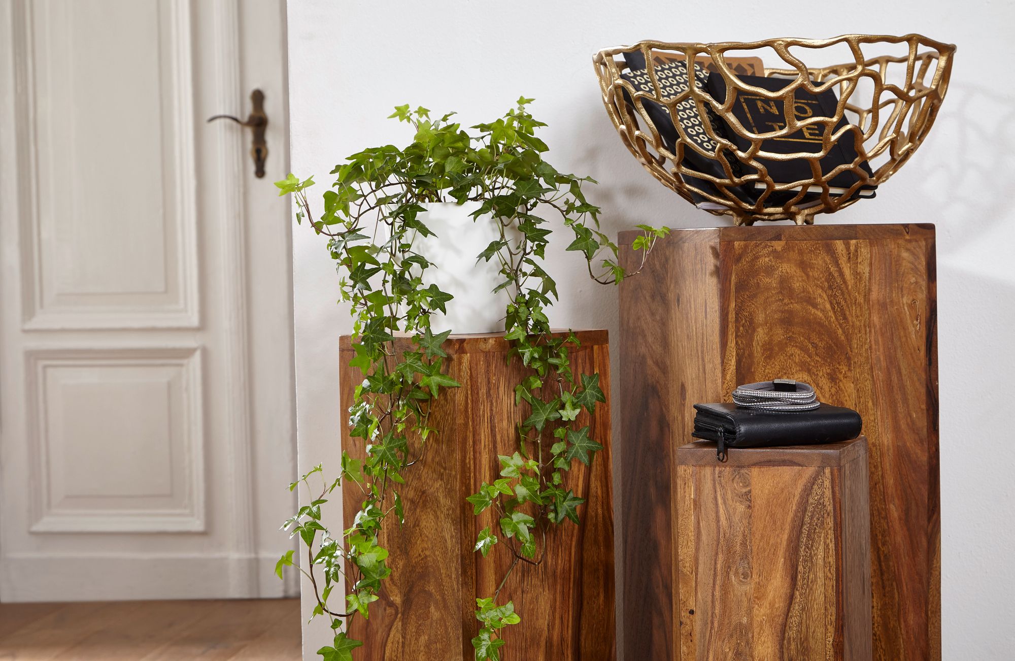 Großer Tisch (BxHxT): 24,5x85x24,5 cm; Mittlerer Tisch (BxHxT): 20x75x20 cm; Kleiner Tisch (BxHxT): 15x65x15 cm; Farbe: Sheesham oder Akazie; Material: Massivholz Sheesham oder Akazie
